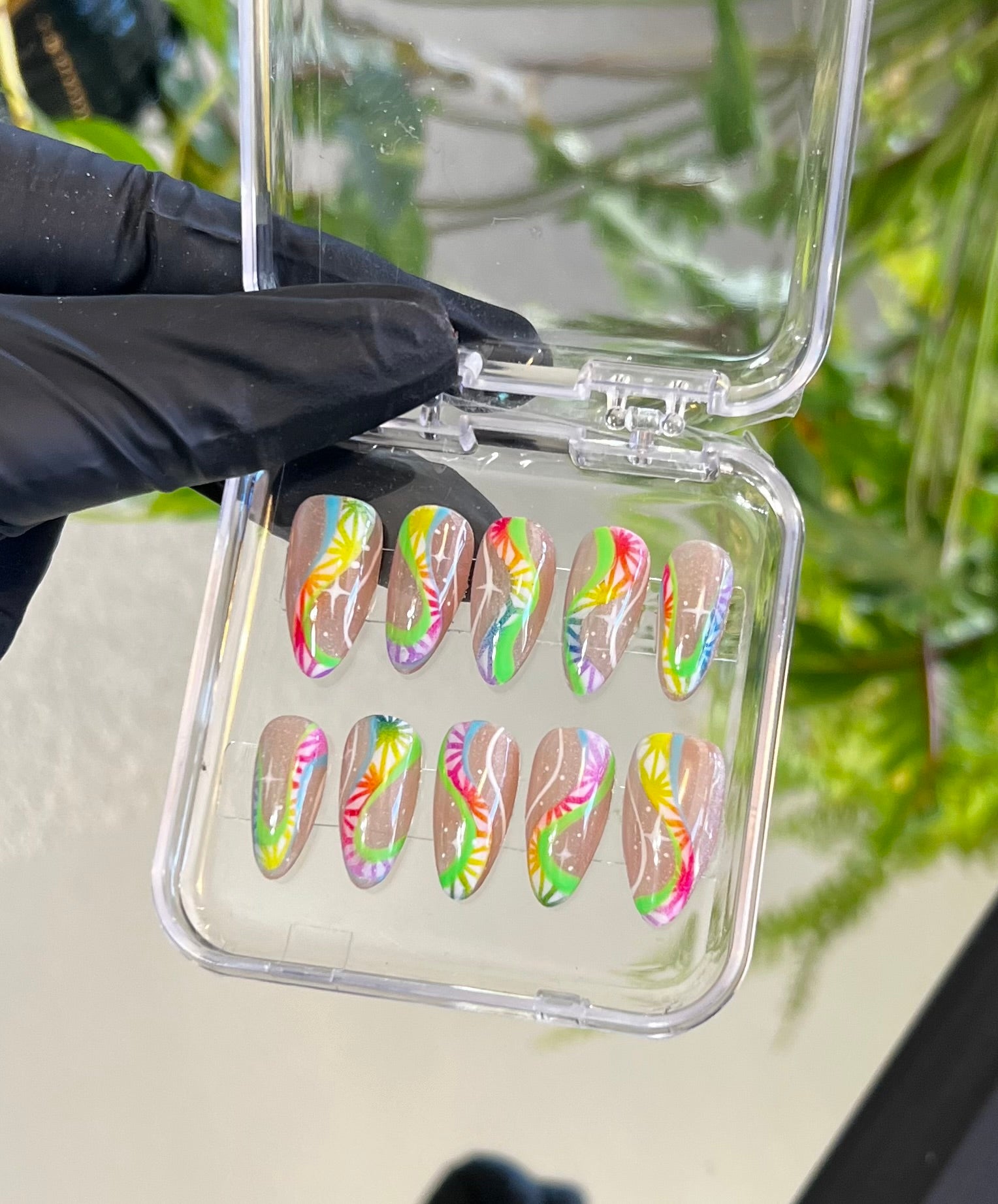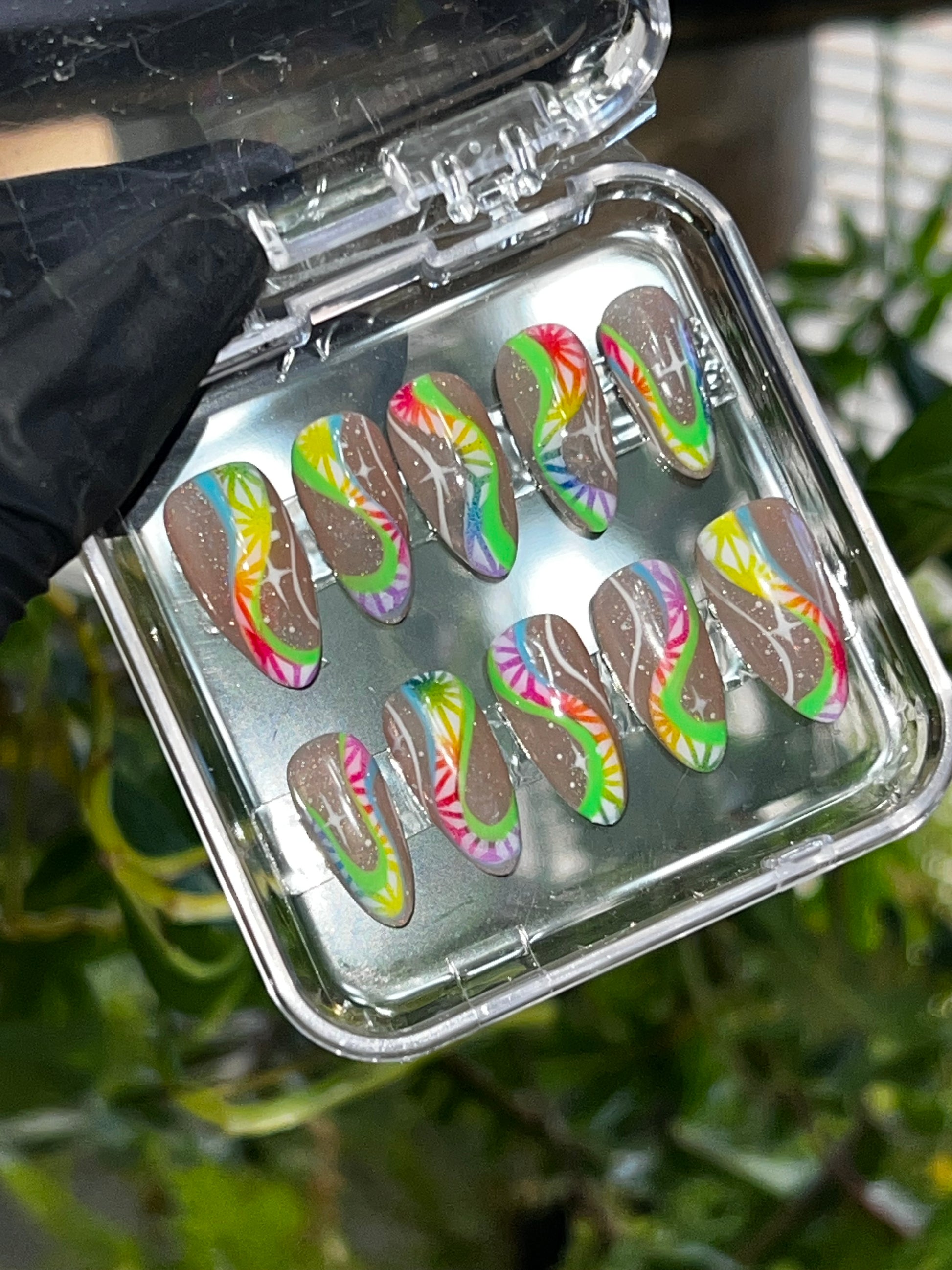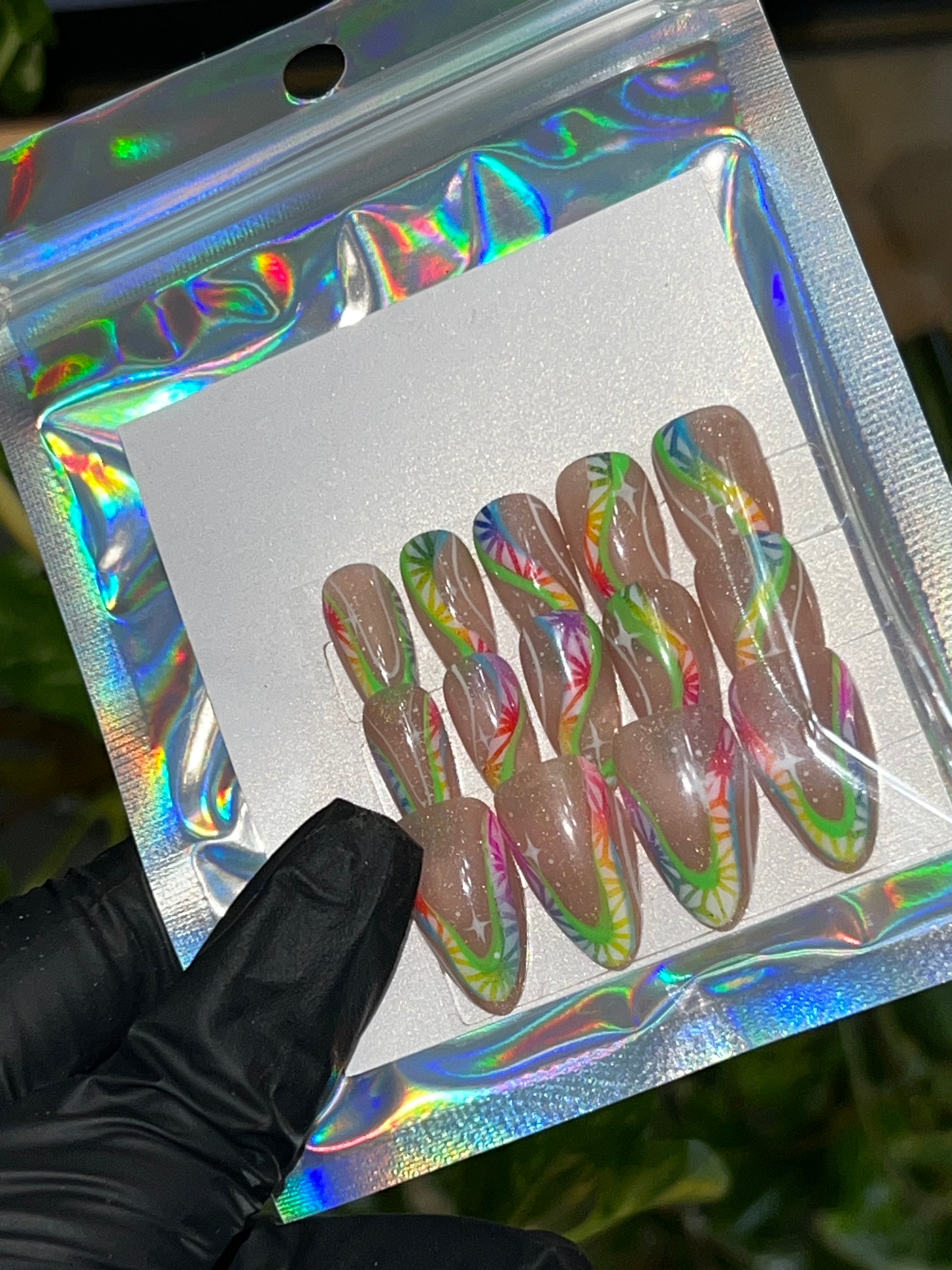 Rhythmic Rainbow is a hand painted and airbrushed medium almond press on nail set. These nails have hand painted swirls with airbrush rainbow detailing atop a jelly nude with subtitle holographic shimmer. The shimmer is too subtitle for photograph. This set is inspired by the way music can make us all feel.