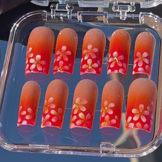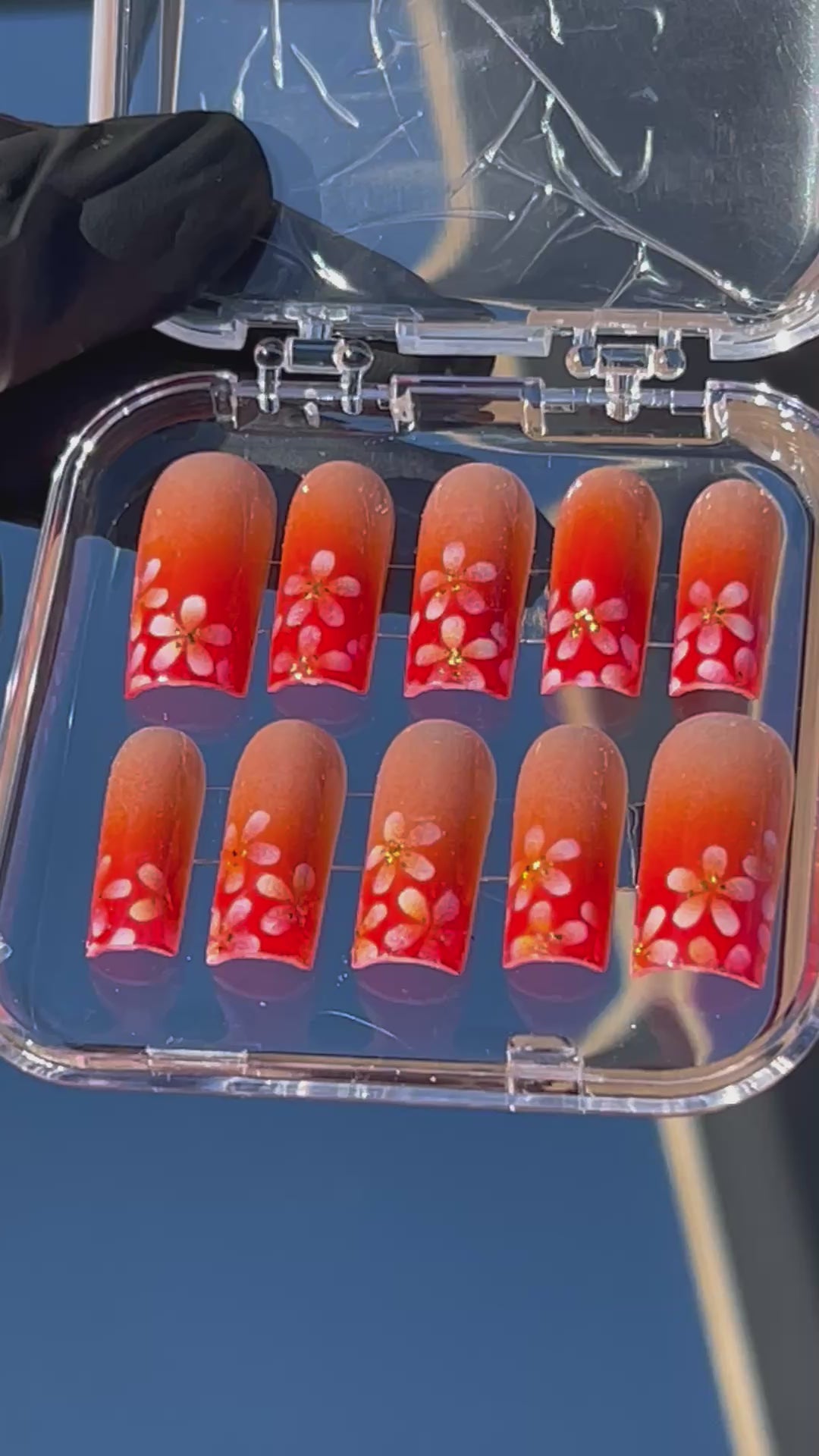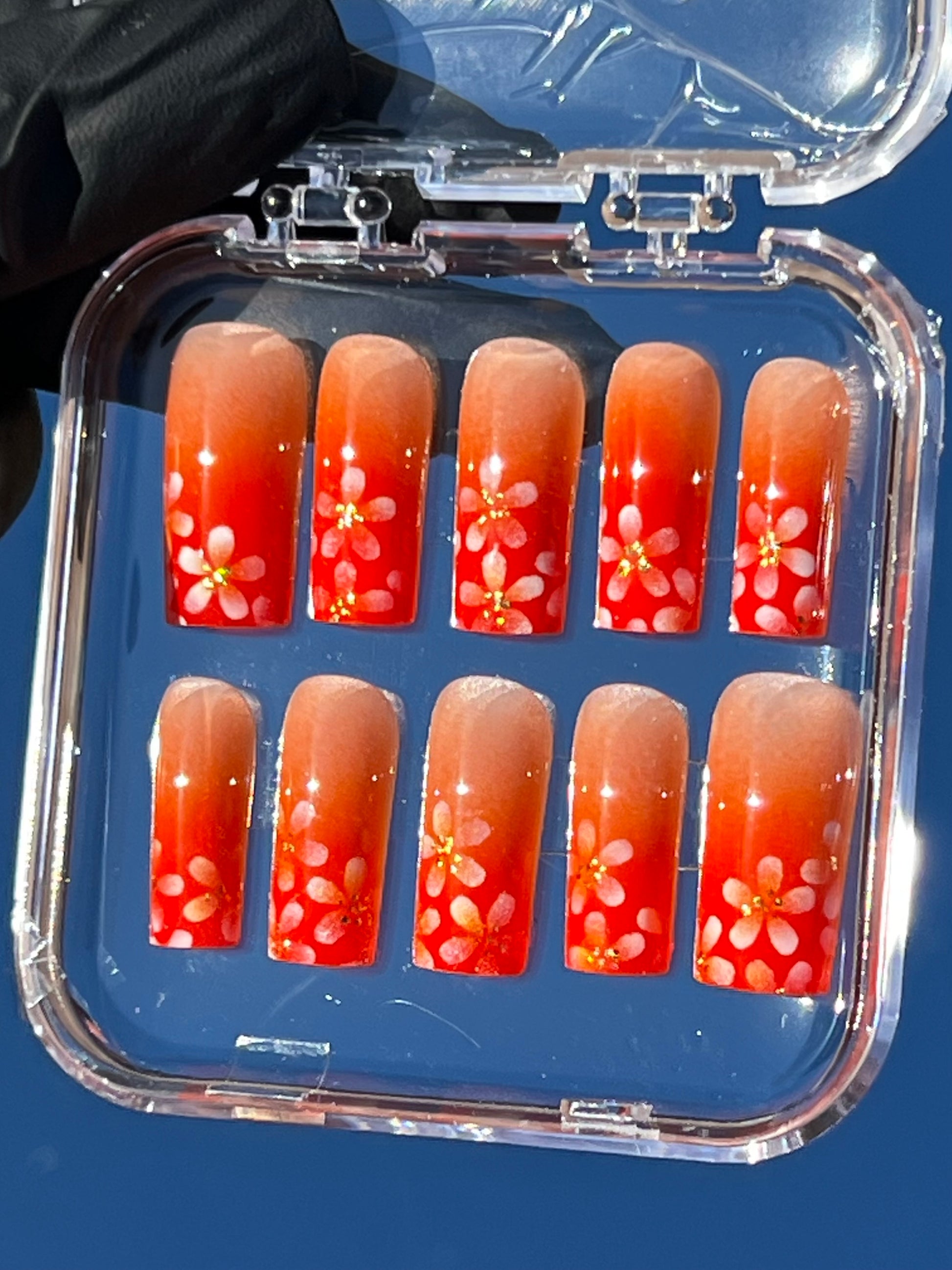 Summer Sangria is an airbrushed medium squote press on nail set. That features ann orange-red ombre atop a nude base with light and airy florals dancing along the tips of the nails. The flowers are adorned with holographic gold details at the center of each.