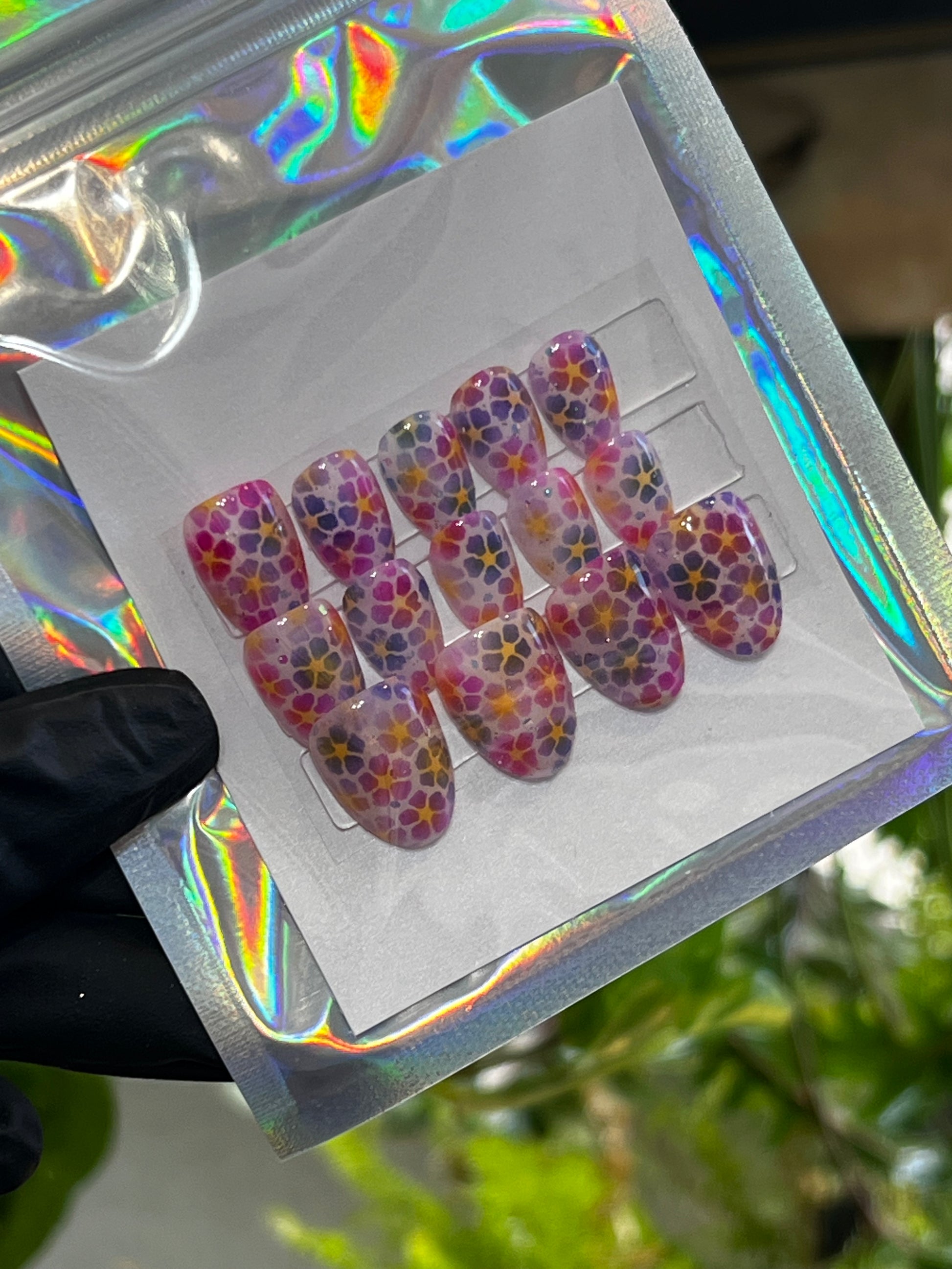Tye-dye Flower is an airbrushed extra short almond press on nail set. These nails have been hand-made with love to fit any summer occasion. The floral design is reminiscent of swimsuit styles from the late 90’s. This set is opaque and does not feature any shimmer or glitter.