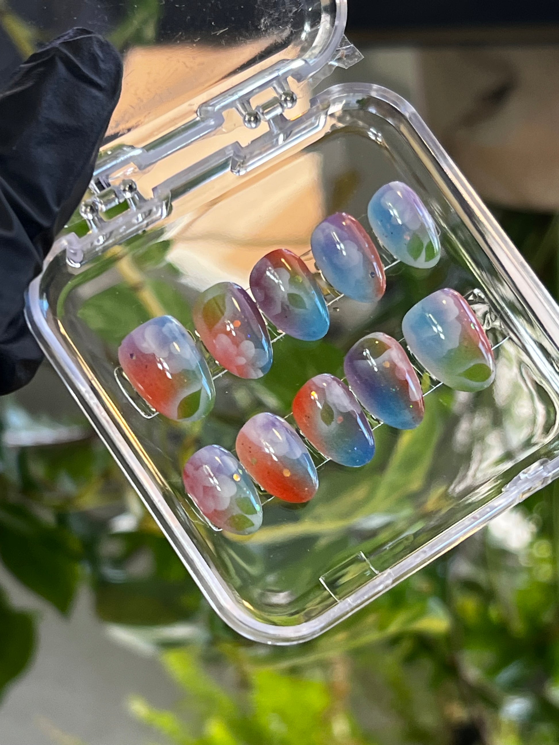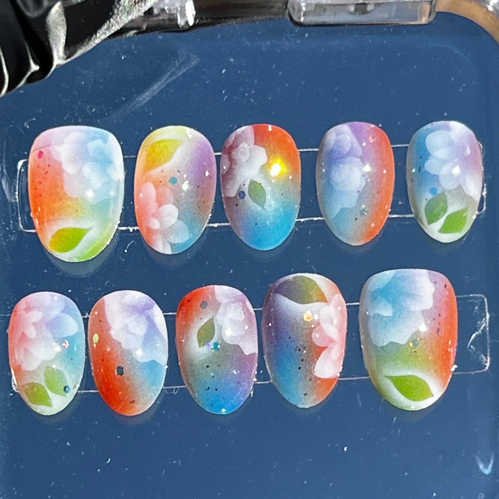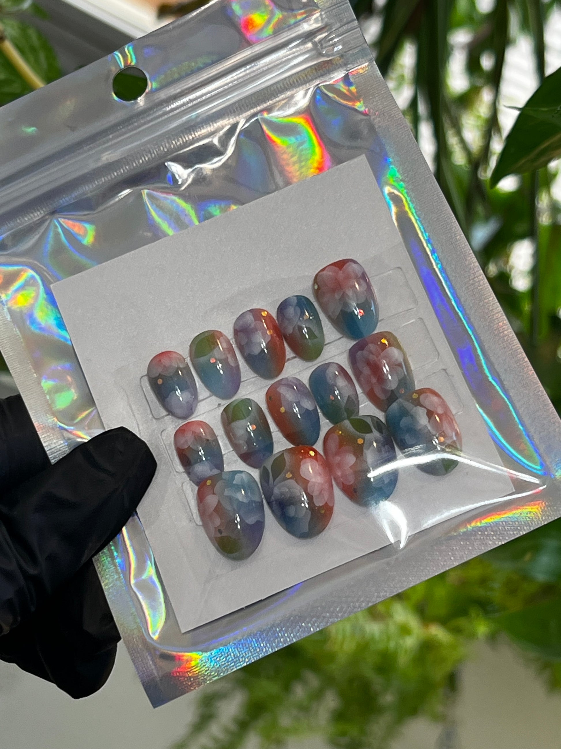 Dreamy Bouquet is an airbrushed extra short almond press on nail set. These nails have been hand-made with a light and airy vibe in mind. This design is inspired by self love and features space iridescent confetti glitter scattered between blooming florals.